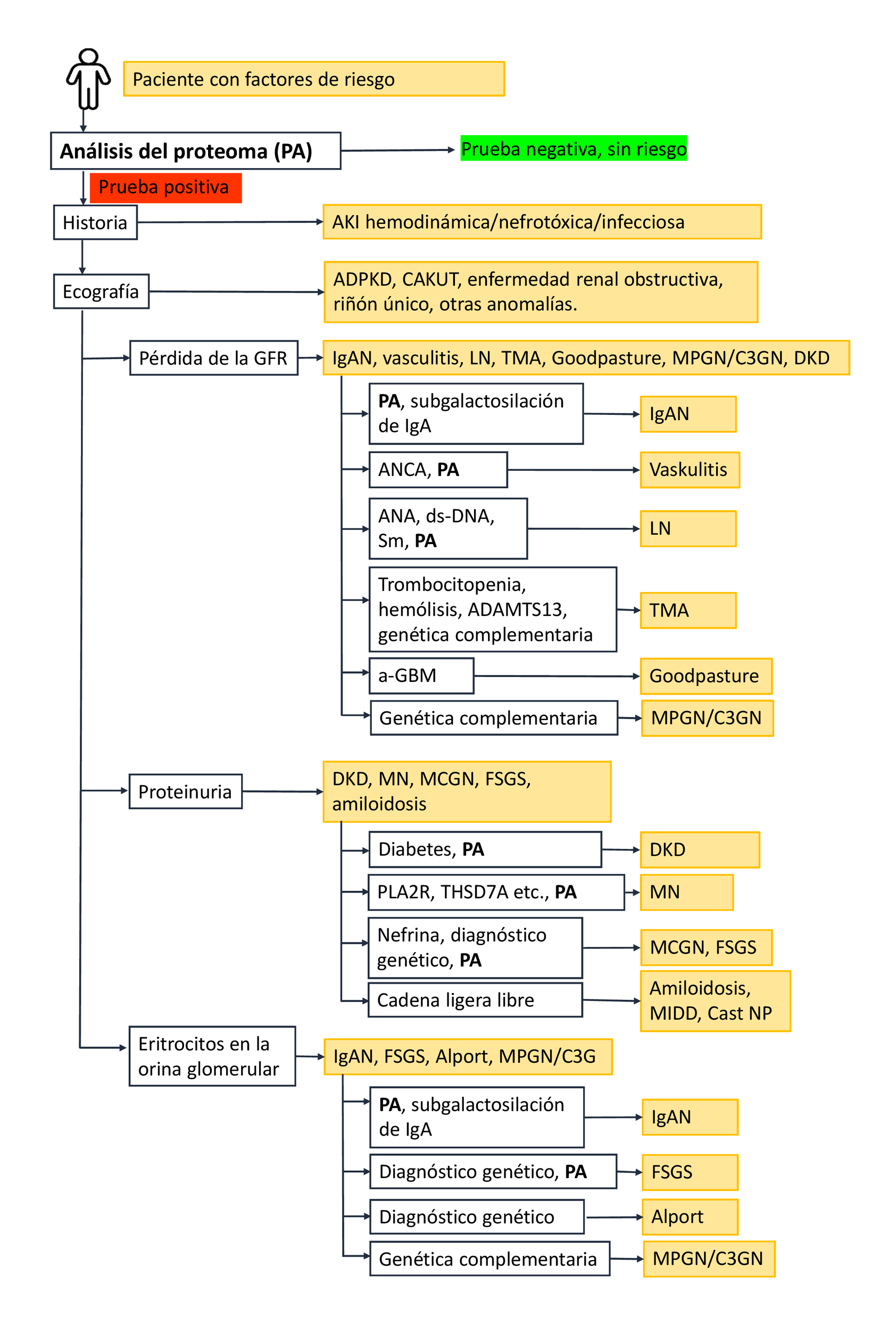 La lesión renal aguda (AKI) causada por problemas circulatorios generalmente se puede diagnosticar de manera confiable basándose en la historia clínica del paciente. Las características de imagen también permiten el diagnóstico de la enfermedad renal poliquística autosómica dominante (ADPKD), así como enfermedades renales obstructivas como las obstrucciones congénitas del tracto urogenital (CAKUT). En las enfermedades renales estructurales no causadas por diabetes o hipertensión, el siguiente paso diagnóstico es el diagnóstico diferencial. Los patrones específicos de péptidos en orina [5, 6] se pueden utilizar para este propósito. En casos de proteinuria glomerular, nefrótica y no selectiva, se debe considerar la glomerulonefritis membranoproliferativa (MPGN/C3GN), la glomeruloesclerosis focal y segmentaria (FSGS), la enfermedad de cambios mínimos (MCGN), la nefropatía membranosa (MN) o la amiloidosis renal. La amiloidosis renal se puede confirmar o descartar por la proporción de cadenas ligeras lambda a kappa. La nefropatía membranosa (MN) puede detectarse mediante autoanticuerpos específicos. Si no se presentan un perfil anormal de cadenas ligeras ni autoanticuerpos para la MN, es probable que se trate de MCGN o FSGS.