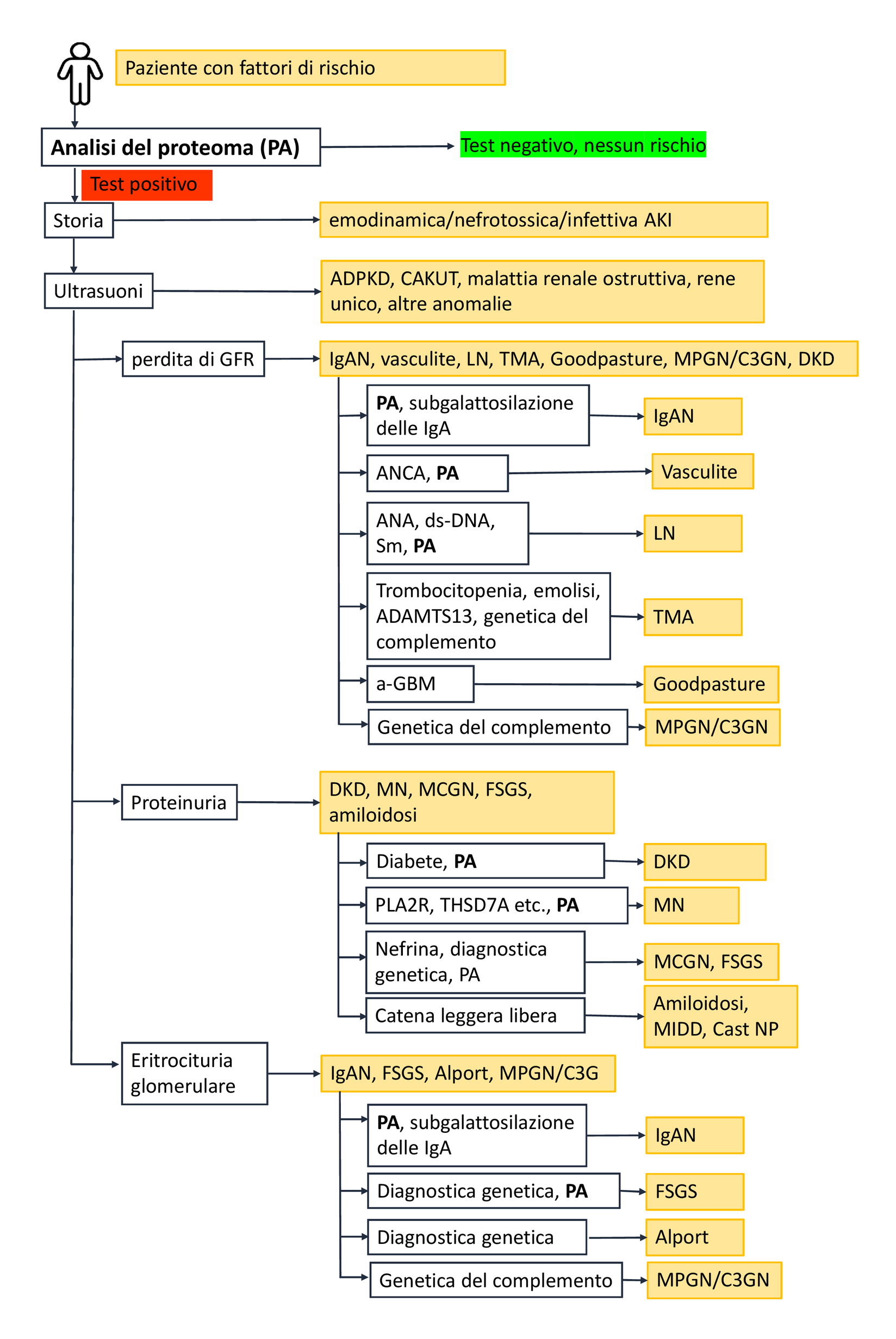 Il danno renale acuto (AKI) causato da problemi circolatori può solitamente essere diagnosticato in modo affidabile sulla base dell'anamnesi del paziente. Le caratteristiche di imaging caratteristiche consentono anche la diagnosi di malattia renale policistica autosomica dominante (ADPKD), nonché di malattie renali ostruttive come le ostruzioni congenite del tratto urogenitale (CAKUT). Nelle malattie renali strutturali non causate da diabete o ipertensione, il passo diagnostico successivo è la diagnosi differenziale. A questo scopo possono essere utilizzati specifici pattern peptidici urinari [5, 6]. In caso di proteinuria glomerulare, nefrosica e non selettiva, si devono prendere in considerazione la glomerulonefrite membranoproliferativa (MPGN/C3GN), la glomerulosclerosi focale segmentale (FSGS), la malattia a lesioni minime (MCGN), la nefropatia membranosa (MN) o l'amiloidosi renale. L'amiloidosi renale può essere confermata o esclusa in base al rapporto tra catene leggere lambda e kappa. La nefropatia membranosa (MN) può essere rilevata da autoanticorpi specifici. Se non sono presenti né un profilo anomalo delle catene leggere né autoanticorpi per la MN, è probabile che si tratti di MCGN o FSGS.