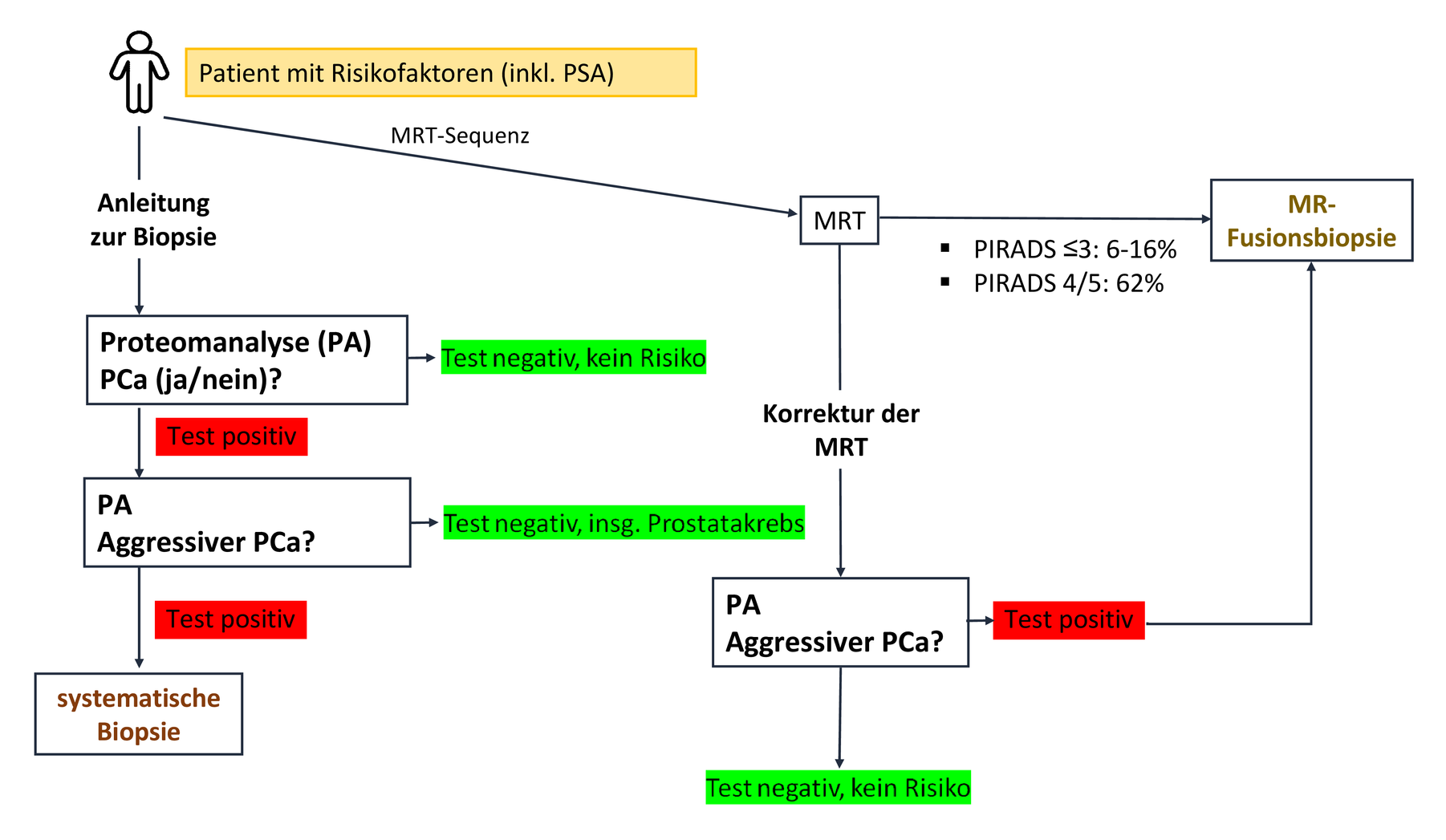 Abbildung 3: Vorgeschlagener Entscheidungsbaum für einen nicht-invasiven, biomarkerbasierten diagnostischen Ansatz bei Prostatakrebs (PCa). Die Abbildung zeigt die verfügbaren diagnostischen Möglichkeiten. Wenn keine sichere Diagnose und ausreichend zuverlässige Therapieempfehlung abgeleitet werden kann, bleibt als letzte Option der invasive diagnostische Ansatz mittels Prostatabiopsie.